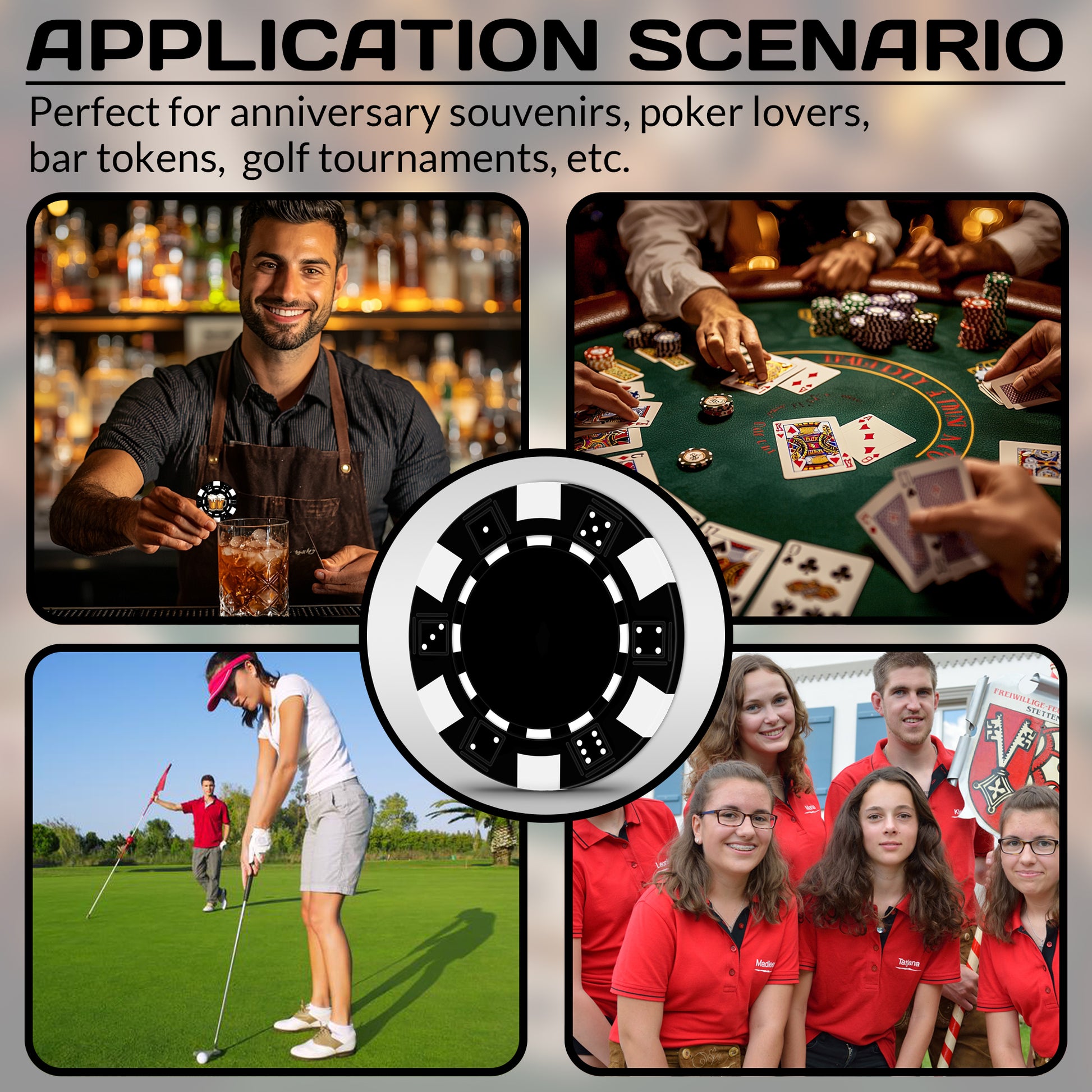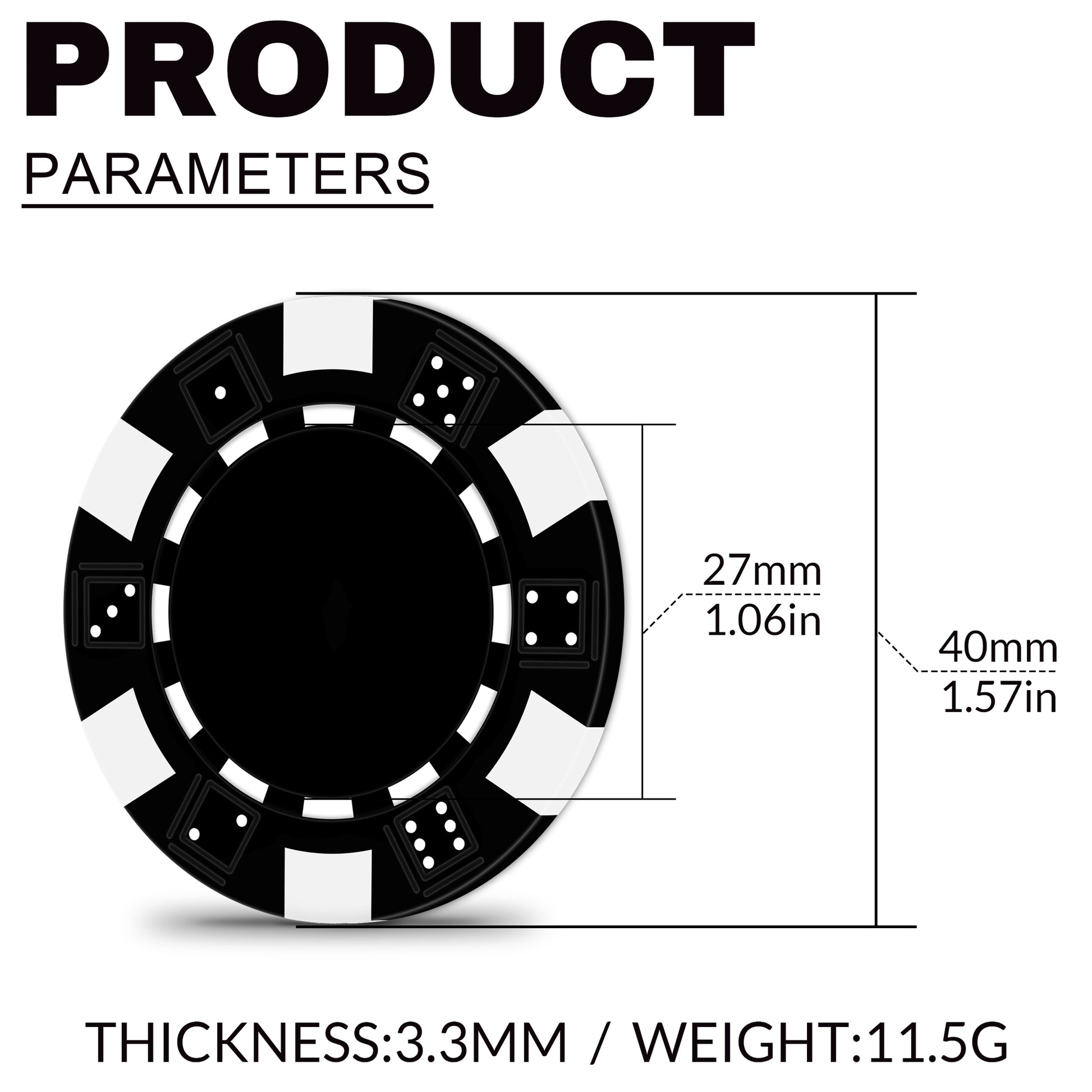 ● chip diameter: 40mm*Thickness: 3.3mm , Weight: 11.5g.